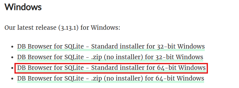 筆者のPCは64bitなので「DB Browser for SQLite – Standard installer for 64-bit Windows」をクリックします。